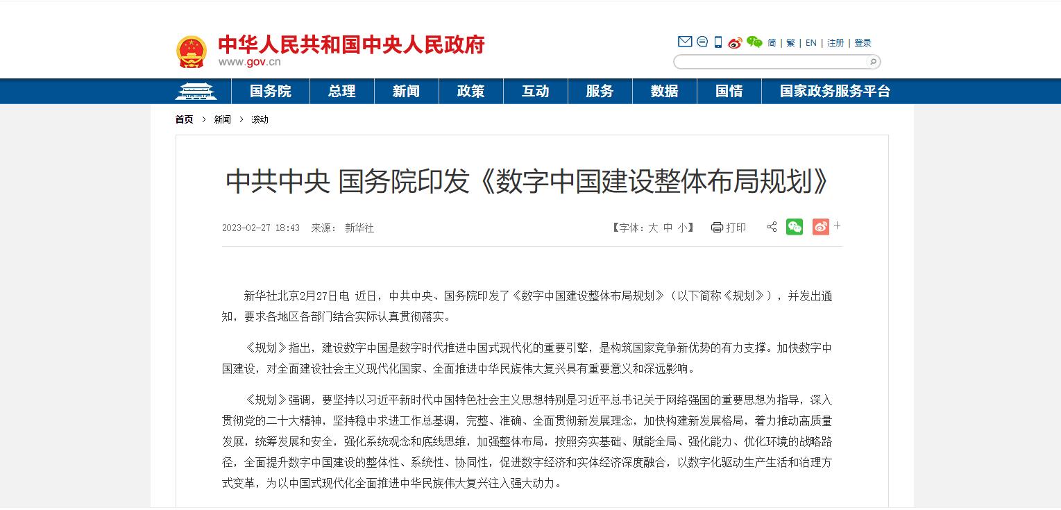 中共中央 國務(wù)院印發(fā)《數(shù)字中國建設(shè)整體布局規(guī)劃》