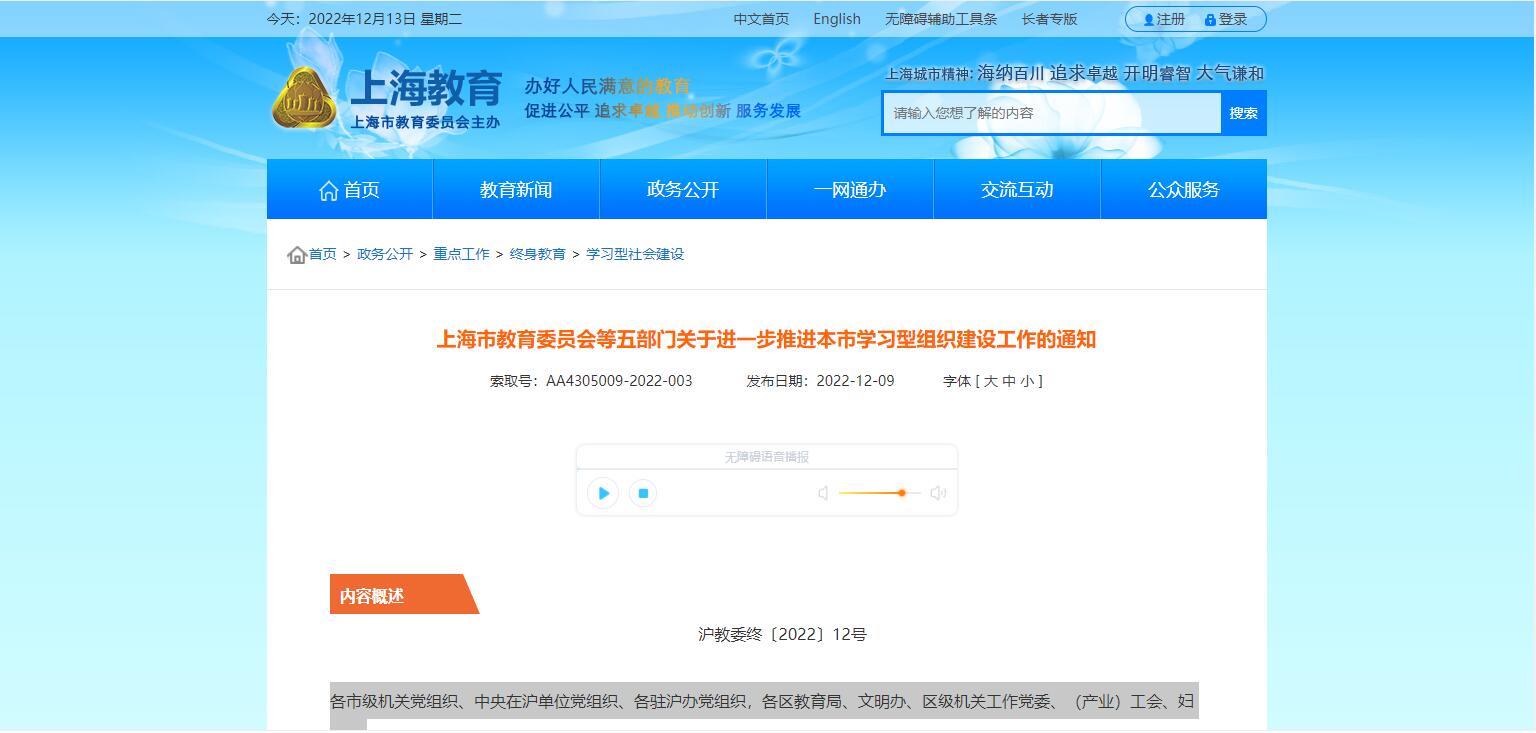 上海市教育委員會(huì)等五部門關(guān)于進(jìn)一步推進(jìn)本市學(xué)習(xí)型組織建設(shè)工作的通知