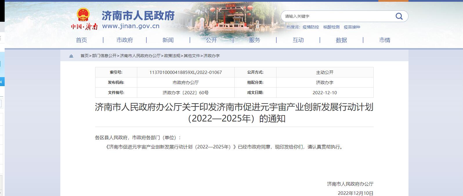 濟(jì)南市政府12月10日發(fā)布《濟(jì)南市促進(jìn)元宇宙產(chǎn)業(yè)創(chuàng)新發(fā)展行動計劃(2022—2025年)》。山東省濟(jì)南市政府12月10日發(fā)布《濟(jì)南市促進(jìn)元宇宙產(chǎn)業(yè)創(chuàng)新發(fā)展行動計劃(2022—2025年)》(以下簡稱《......