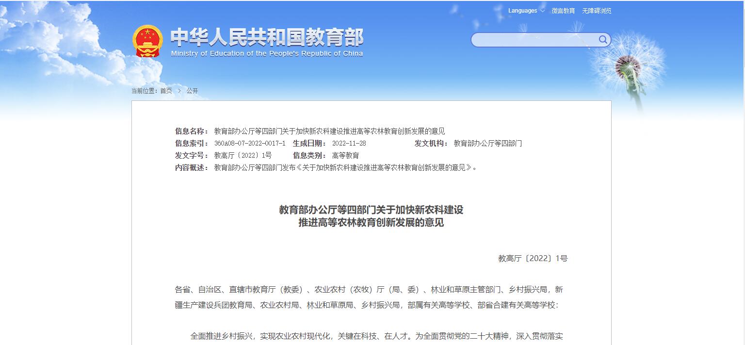 教育部辦公廳等四部門關(guān)于加快新農(nóng)科建設(shè)推進(jìn)高等農(nóng)林教育創(chuàng)新發(fā)展的意見(jiàn)